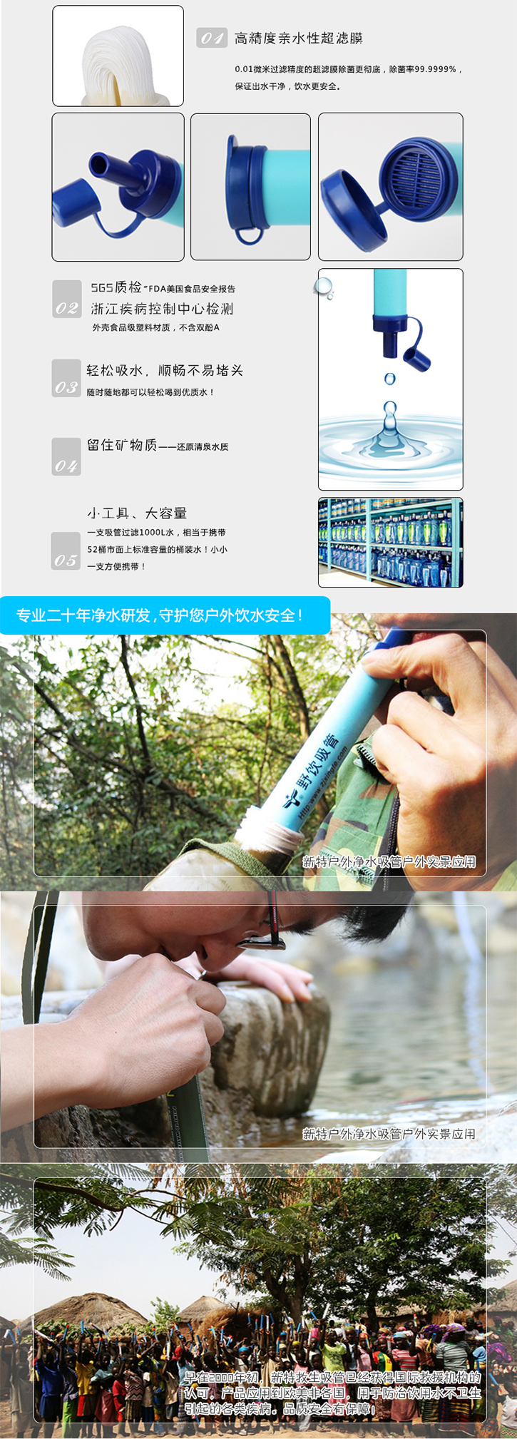 B1型微型野外生存凈水吸管采用碳纖維活性炭過濾層+顆粒椰殼活性炭過濾層+高聚碘殺菌樹脂過濾層結(jié)構(gòu),規(guī)格尺寸180×Φ33mm,使用壽命800L,重量凈重55g毛重70g,包裝規(guī)格21X5X3.5cm,顏色為天藍色,軍綠迷彩,樹葉迷彩,沙漠迷彩等多種可選.