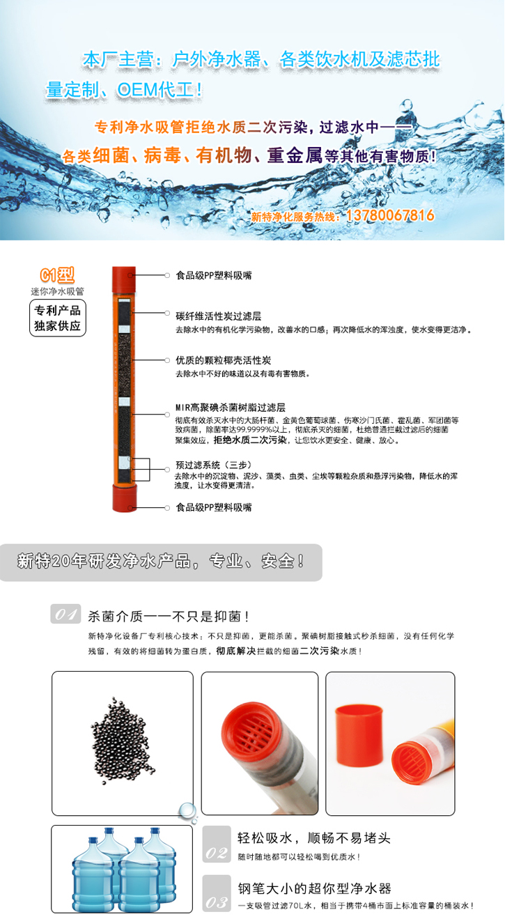 結(jié)構(gòu):C1型采用了"高聚碘殺菌樹脂過濾層+顆粒椰殼活性炭+碳纖維活性炭過濾層"的結(jié)構(gòu)(詳見下方圖文中的C1型迷你凈水吸管結(jié)構(gòu)圖),C2型采用“高聚碘殺菌樹脂過濾層+顆粒椰殼活性炭+碳纖維活性炭過濾層+納米KDF”結(jié)構(gòu)(外觀結(jié)構(gòu)同C1型)