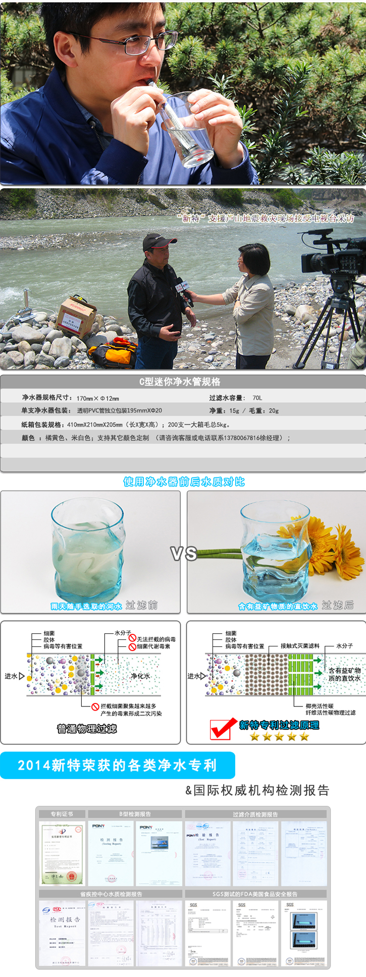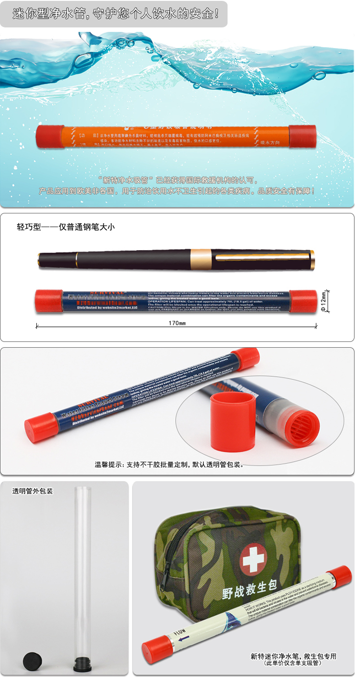 C1型和C2型救生包專用迷你凈水生命吸管是本廠研發(fā)的微型戶外吸管型凈水器(凈水筆),僅15g只有鋼筆大小,應(yīng)急救生包專用!可立即將河水、雨水、湖水等天然水凈化為含有益礦物質(zhì)的直接飲用水,可過濾病毒、細(xì)菌、有機(jī)物、重金屬等沒有二次污染!