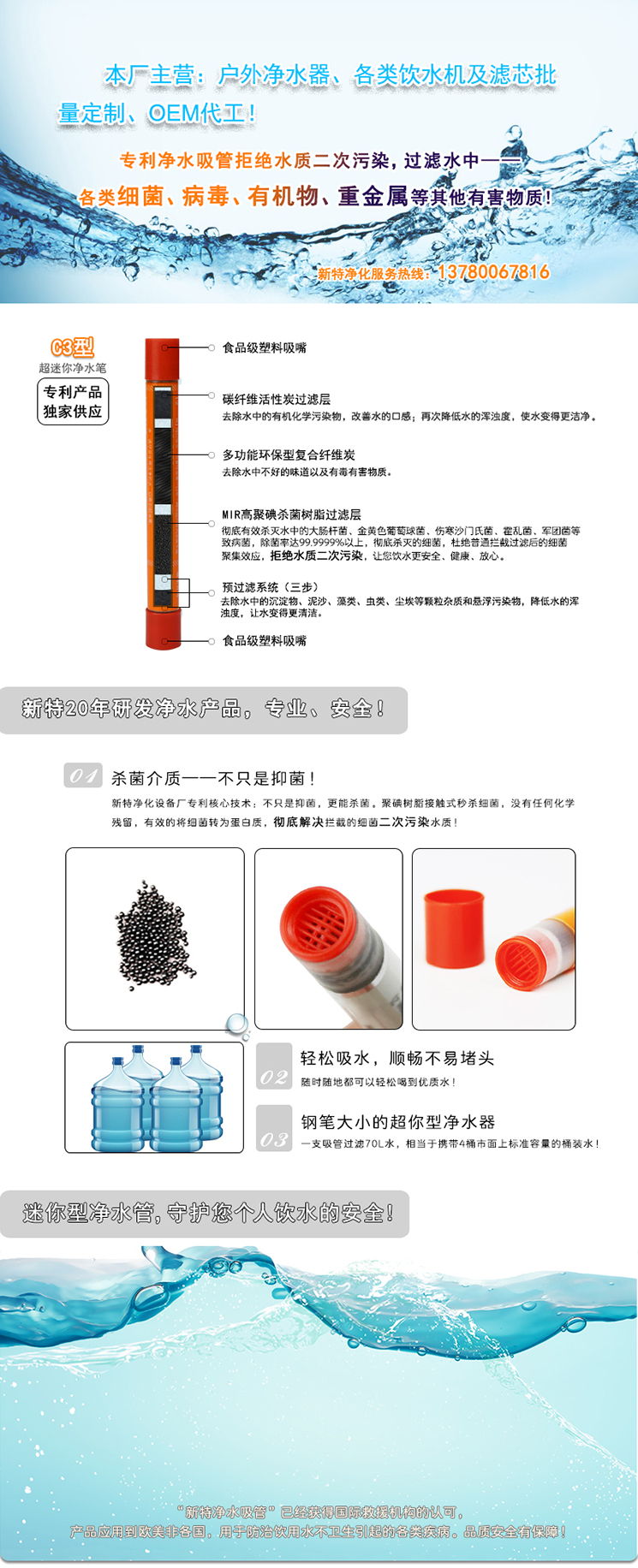 B1型微型野外生存凈水吸管采用碳纖維活性炭過濾層+顆粒椰殼活性炭過濾層+高聚碘殺菌樹脂過濾層結構,規格尺寸180×Φ33mm,使用壽命800L,重量凈重55g毛重70g,包裝規格21X5X3.5cm,顏色為天藍色,軍綠迷彩,樹葉迷彩,沙漠迷彩等多種可選.