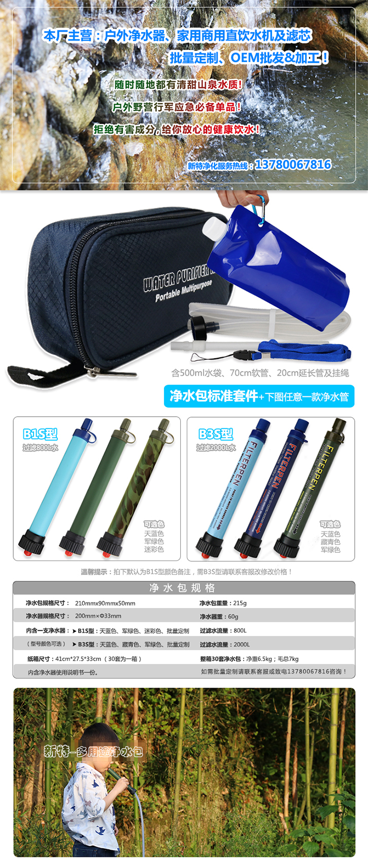 “凈水包”內(nèi)含:野飲吸管一支(有B-S型、B3-S型可選);配套750ml水袋一個(gè);B1S型配1米軟管一根(B3S型配0.7米軟管)、配套20cm長(zhǎng)可伸縮吸管一根。
