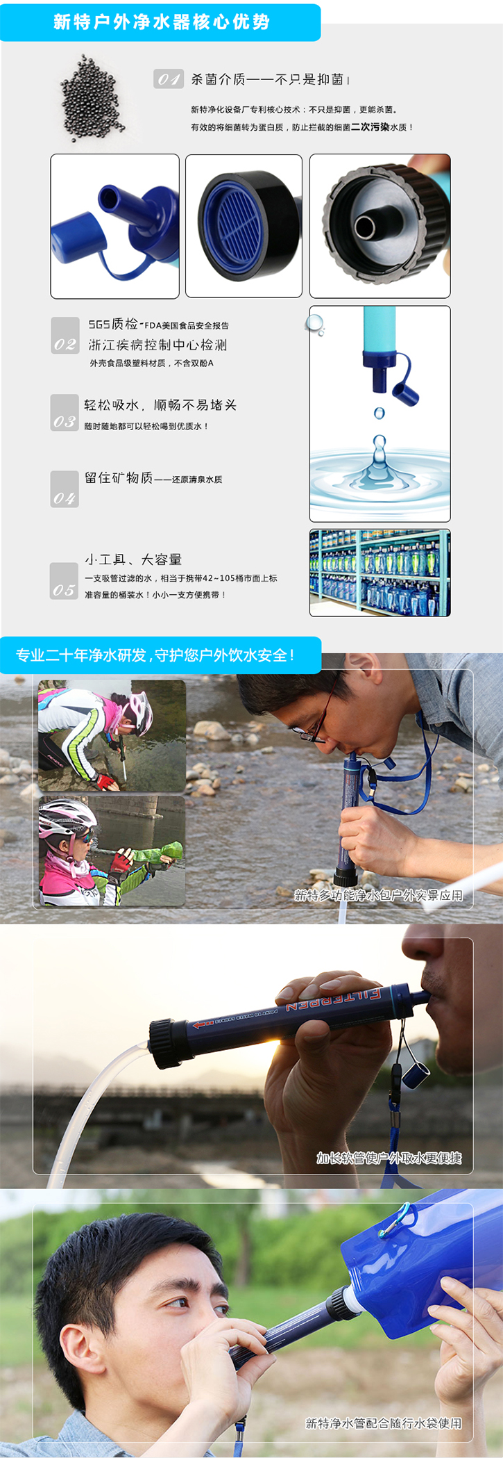 野外凈水生命吸管是一種輕巧、便捷、安全的戶外便攜式吸管型凈水器,新特研發(fā)的專利產(chǎn)品戶外便攜式凈水器是殺菌介質(zhì)與物理過(guò)濾完美的結(jié)合,可立即將河水、雨水、湖水等天然水凈化為直接飲用水,可過(guò)濾病毒、細(xì)菌、有機(jī)物、重金屬等沒(méi)有二次污染!