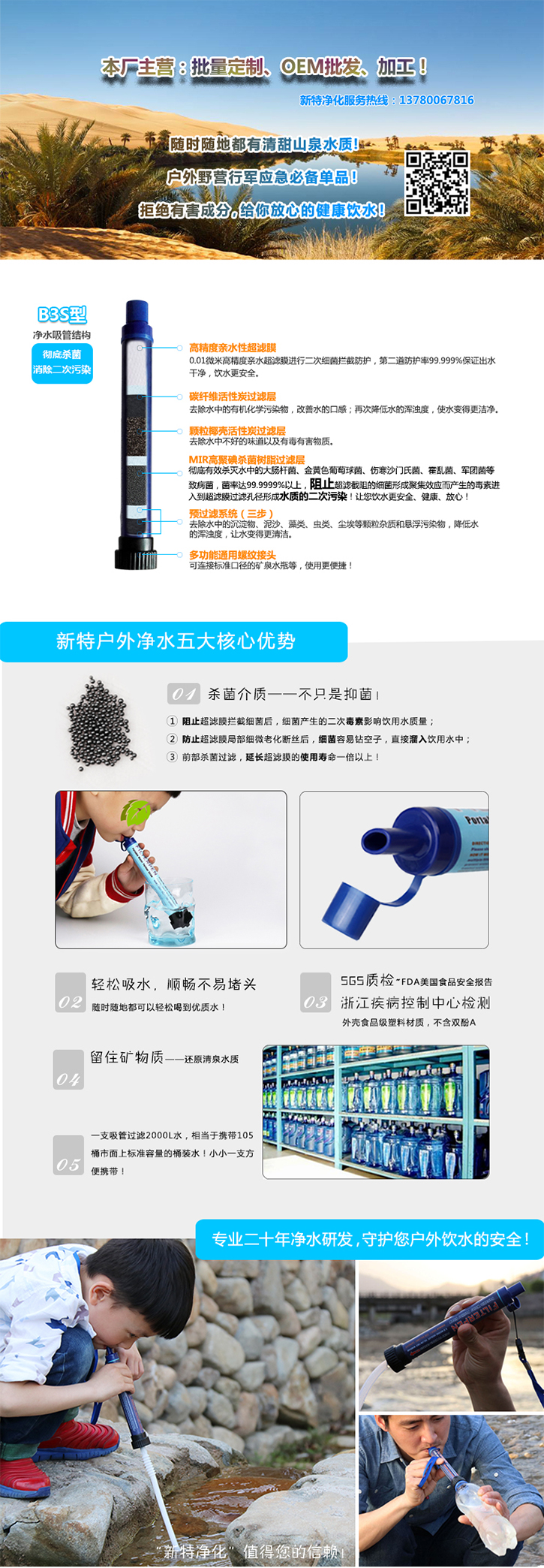 B3型戶(hù)外個(gè)人生存凈水器采用高聚碘殺菌樹(shù)脂過(guò)濾層+顆粒椰殼活性炭過(guò)濾層+碳纖維活性炭過(guò)濾層+高精度親水超濾膜結(jié)構(gòu),規(guī)格尺寸180×Φ23mm,重量?jī)糁?5g毛總70g,顏色為天藍(lán)色,深藍(lán)色,軍綠色等多種可選,使用壽命2000L.