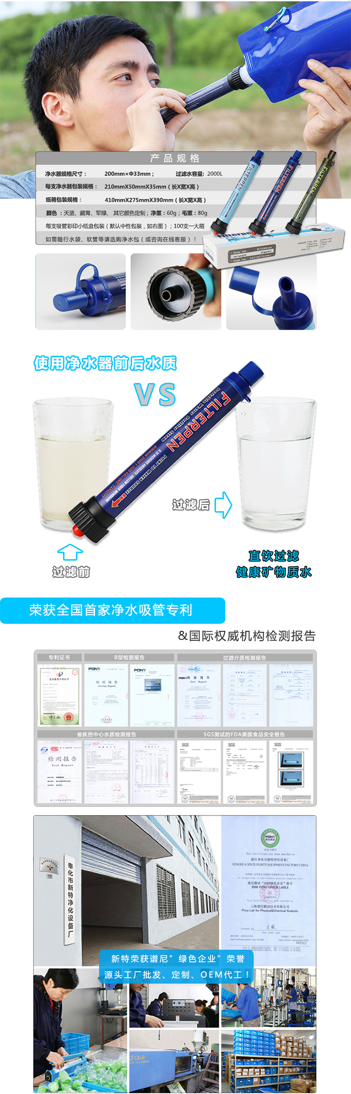 A1型微型野外凈水器采用高聚碘+顆粒活性炭結(jié)構(gòu),規(guī)格尺寸250×Φ27mm,重量?jī)糁?0g毛總110g,顏色為天藍(lán)色,軍綠迷彩色,樹(shù)葉迷彩色等可選,包裝規(guī)格26.5X5.5X3cm,使用壽命1000L,A2型A3型戶(hù)外凈水吸管結(jié)構(gòu)與A1型有區(qū)別.